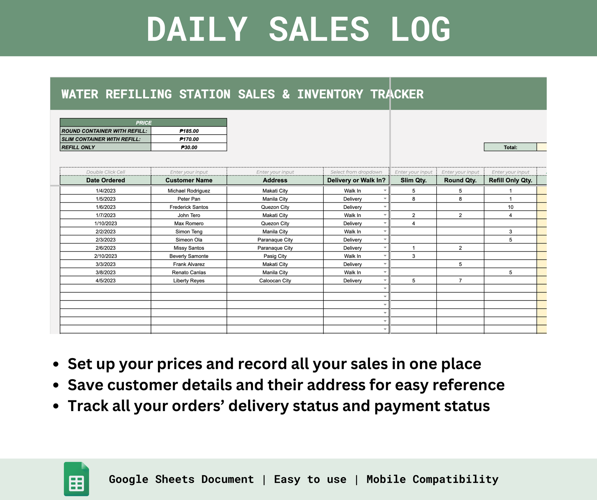 The Water Refilling Stations Sales & Inventory Tracker is a simple and easy-to-use spreadsheet for your small business!
